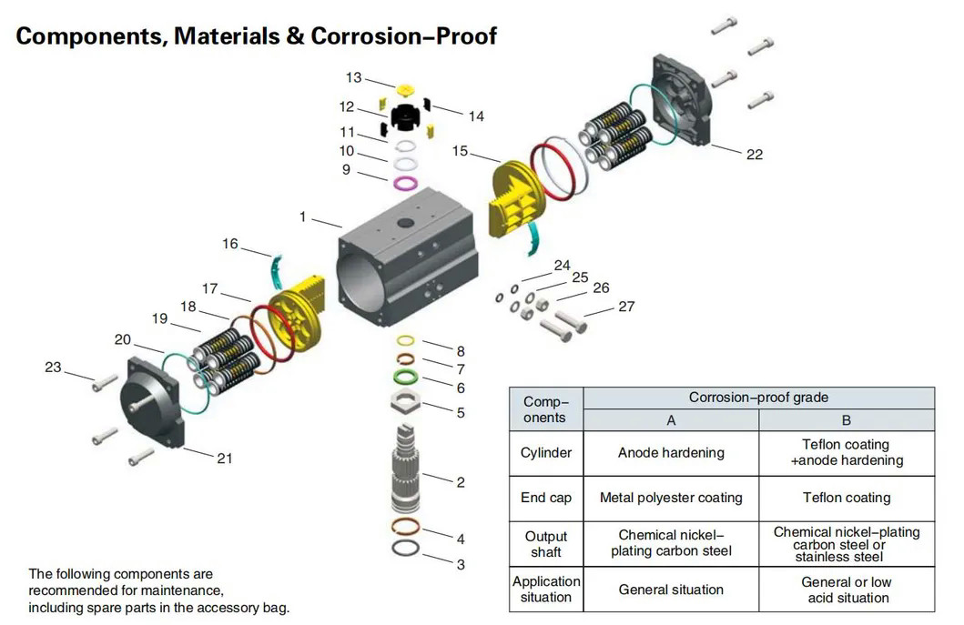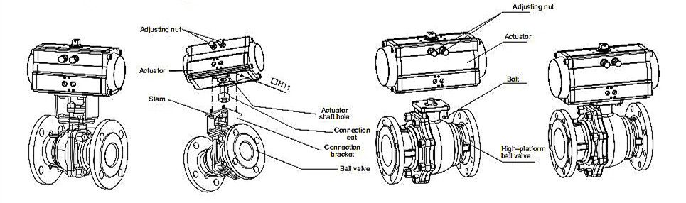 Az indítószerkezet és a golyóscsap összeszerelése általában egy konzol és csatlakozókészlet segítségével történik. Alternatív megoldásként úgy is összeszerelhetők, hogy a speciális szárat a pneumatikus állítómű tengelyfuratába helyezik. Ügyeljen arra, hogy az orsó orra ne nyúljon ki a hajtómű tengelyfuratán, mert ez meghibásodást okozhat az elakadás miatt. Minden csatlakozó alkatrésznek nagy összeszerelési pontossággal kell rendelkeznie; ellenkező esetben a nyitási vagy zárási szög változása a szelep szivárgását okozhatja. Az alkatrészek összeszerelési tűrésének meg kell felelnie a vonatkozó szabványoknak. A tengelyfurat (szár), a négyzet alakú furat és a horony orsóorrának tűrése H11/d11, párhuzamosság és szimmetria 9. fokozatú geometriai tűréssel.